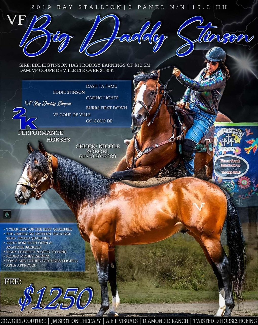 NVF Big Daddy Stinson is a true 1D junior stallion. Ed is a son of Eddie Stinson ($10M sire and out of the amazing mare VF Coup DeVille (LTE 125K+). Ed's first foals are 3 years old and absolutely beautiful. Ed has amazing athleticism and confirmation that he passes down to his foals. Some of Ed's accomplishments are: